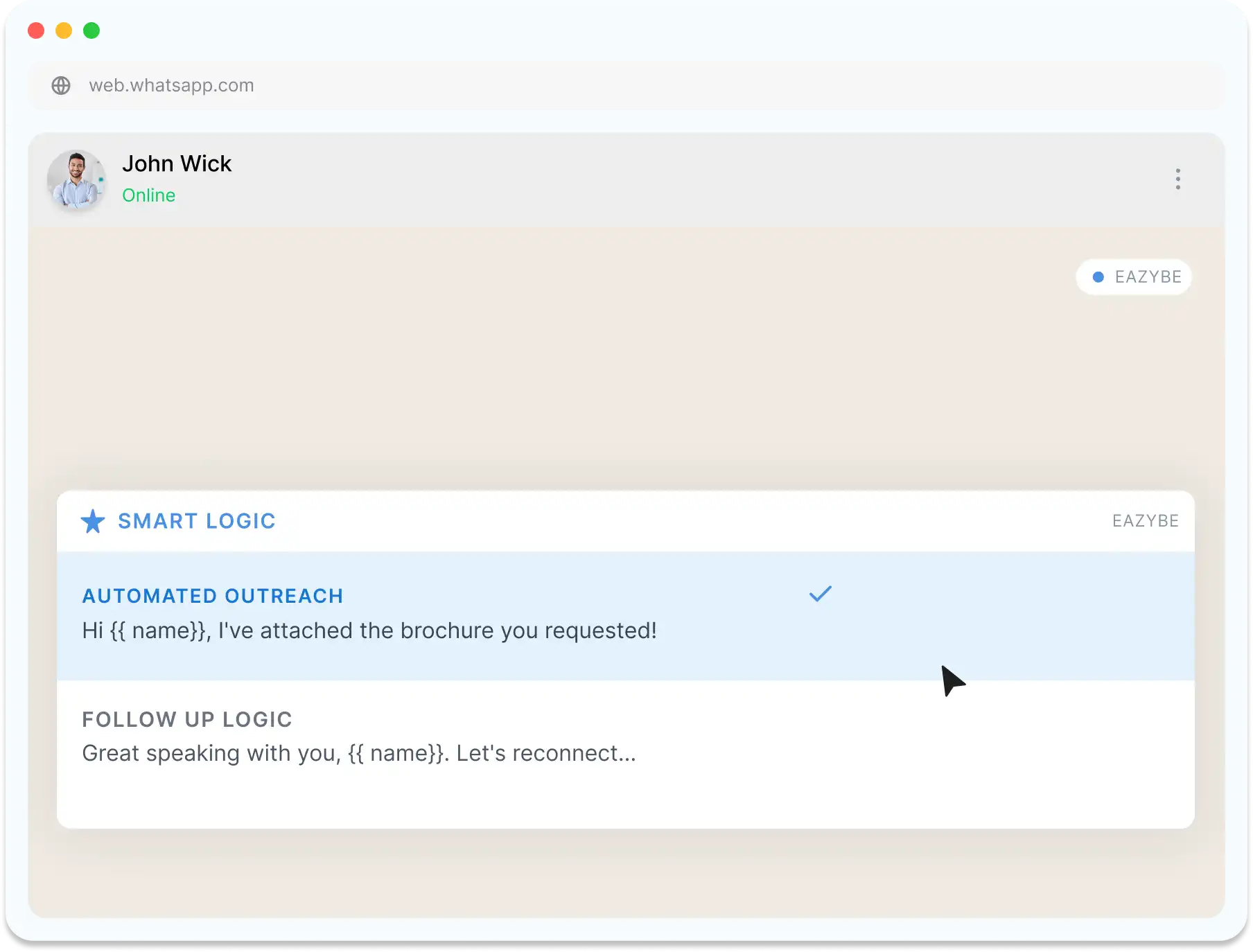 Eazybe fixes this. It brings the power of your CRM straight into WhatsApp Web.