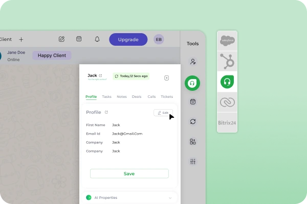 Get CRM Context right beside the live conversation, your rep can see the entire customer story—deal stage, purchase history, support tickets, and contact details.