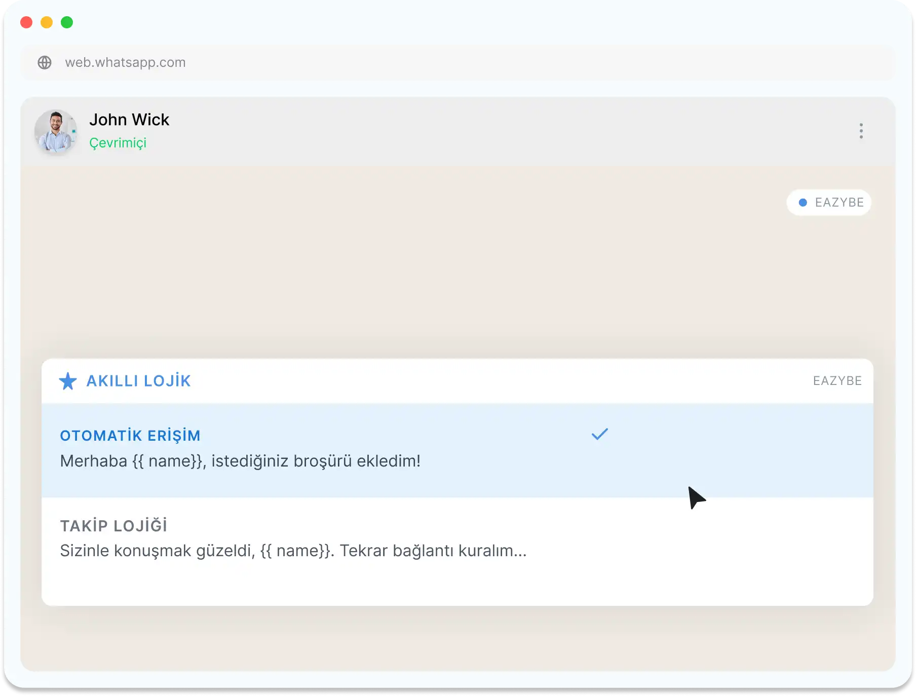 Eazybe bu sorunu çözüyor. CRM'inizin gücünü doğrudan WhatsApp Web'e getiriyor.