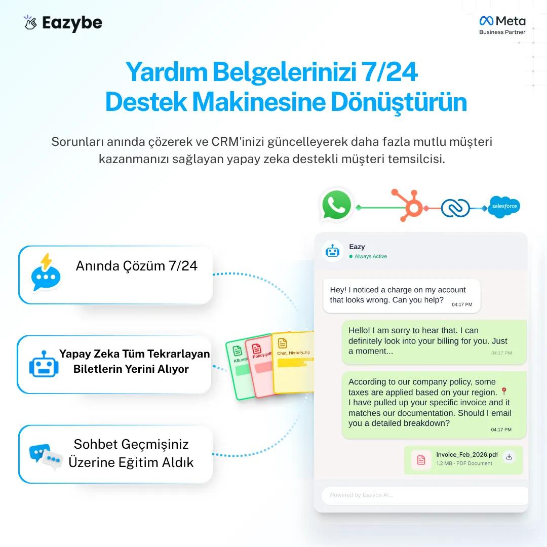 Eazybe ile - WhatsApp AI temsilcisi CRM entegrasyonuyla her şey daha da kolaylaşıyor. Eazybe, Salesforce gibi araçlara bağlanır, böylece satıştan sorumlu yapay zeka temsilciniz müşteri ayrıntılarını doğrudan WhatsApp'ın içinde görebilir. Bu, daha hızlı ve daha doğru yanıtlar vermenize yardımcı olarak konuşmaları daha sorunsuz hale getirir ve daha fazla anlaşma yapmanıza yardımcı olur.